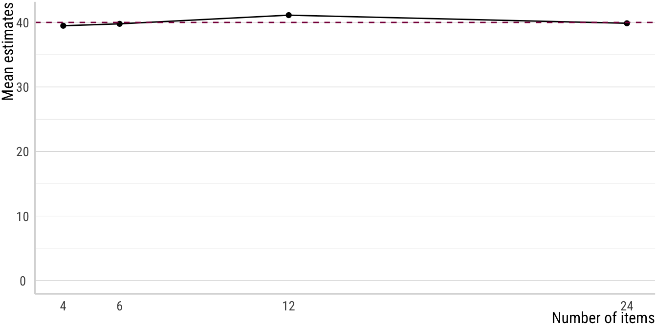mean_model_se) decreases asn_itemsincreases — from ~20 \(\Rightarrow\) ~10. This means that the standard errors are overestimated with few items and approach our approximated standard error of ~8.2 with more items. - The coverage (proportion of 95% CIs covering the true value) improves with more items: 0.858 \(\Rightarrow\) 0.946.