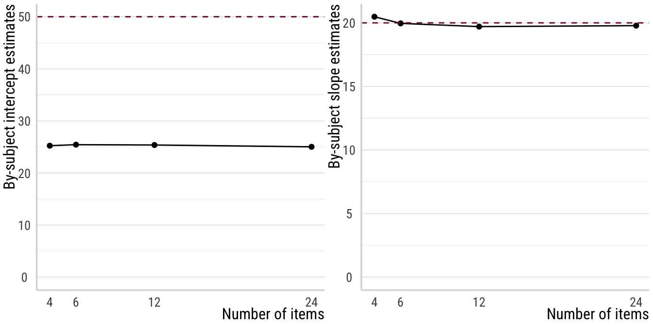 There is more to be said about these results, of course, but I think the main takeaways are already clear enough from what we have seen so far. For anyone who’s interested (in potentially investigating the puzzling aspects of the above), let me briefly list what I consider mysterious: it is not at all clear to me why the intercept estimates appear to be half the size of the simulation parameter (without approaching the true value with increases in item number) while the slope estimates are much closer to the true value and also appear to approach it with more items. What I would expect, first of all, is that both estimates are underestimated (because they are both biased estimators) and, second, that both estimates approach the true value with more items. Lastly, I do not understand why the by-subject variance components are also underestimated, given that we have enough participants to estimate them well.